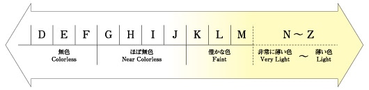 ▼カラット(重さ) 重量を表します。1カラット=0.2グラム。 ▼カラー(色) カラーのグレードはGIA基準のマスターストーンで比較され、等級付けされます。 色のない無色透明なのものが一番良いものとされ、グレードがおちるほど黄色味を帯びてきます。
