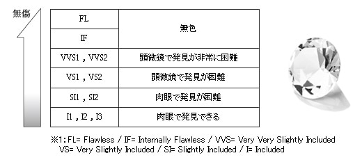 ▼クラリティー(透明度) 天然のダイヤモンドには、ほとんど全てのものにインクルージョン(内包物)が含まれています。 このインクルージョンと細かな傷を鑑定士が顕微鏡でチェックし、下記のような等級で評価されます。