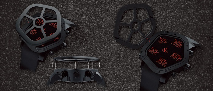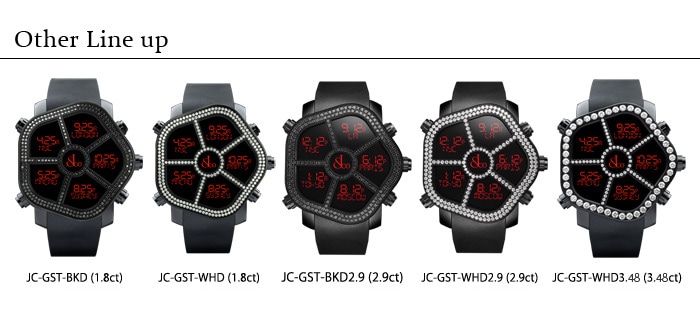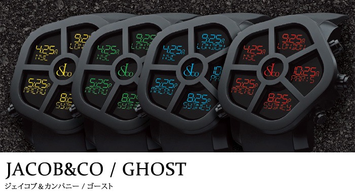 ジェイコブの代表的なモデルの5タイムゾーンの表示方法を踏襲しながら、最新鋭の機能を盛り込んだのがゴーストです! 「ゴースト(幽霊)」というネーミング通り、ケースサイドのボタンを押すと真っ黒のフェイスに5ヵ国の時刻がデジタル表示で浮かび上がります。 さらに中央の丸い窓からはジェイコブのロゴが“夜空に浮かぶ星や暗闇からあらわれる幽霊のように”浮かび上がる仕組みとなっています。