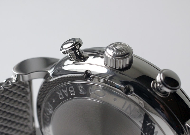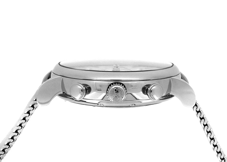 1960年代のイタリアンスポーツカー操縦席のデザインを取り入れた、クラシカルなトランペット型のクロノグラフプッシュボタンが特徴です。シルバーカラーの針やインデックスは控えめながら、モダンで美しい表情を見せてくれます。