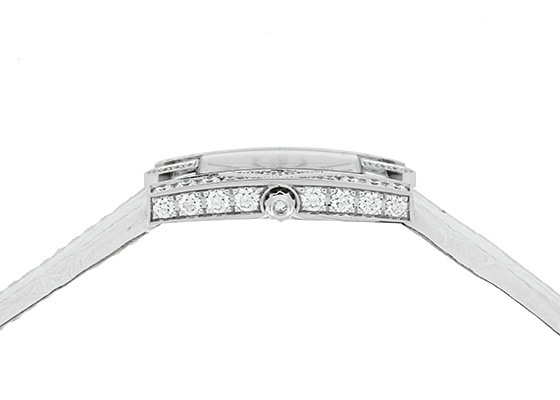 このモデルはホワイトゴールドのケースの前面だけではなく側面まで惜しみなくダイヤモンドがセットされた、女性向けの「アヴェニュー オーロラ」。ベゼル部分はこのモデルだけの特別なデザインが使われています。