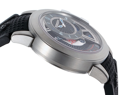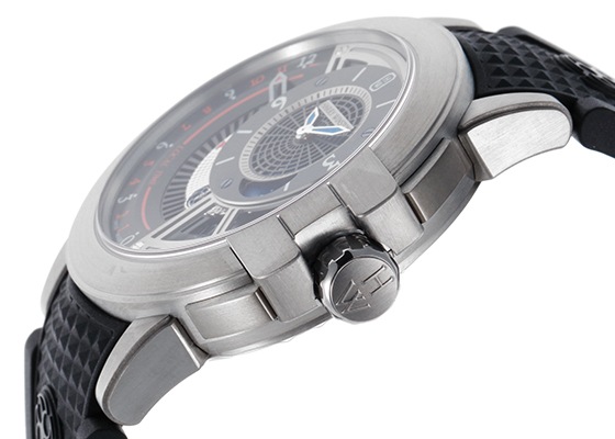 レトログラードが使われたデュアルタイム表示が特徴のこのモデルは、レトログラードの第二時間帯部分を赤、右上のサークル部分を青でカラーリング。
