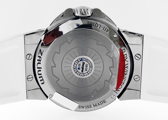 ケースに使われているザリウムは、ジルコニウムを主成分とした合金で、チタンよりも硬く耐蝕性に優れている上に軽量であり、光沢のあるガンメタルシルバーは他にはない個性を感じさせてくれます。