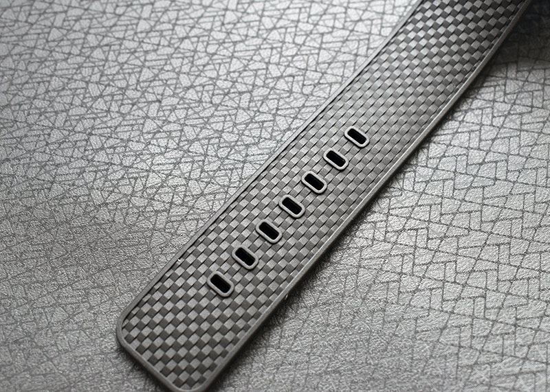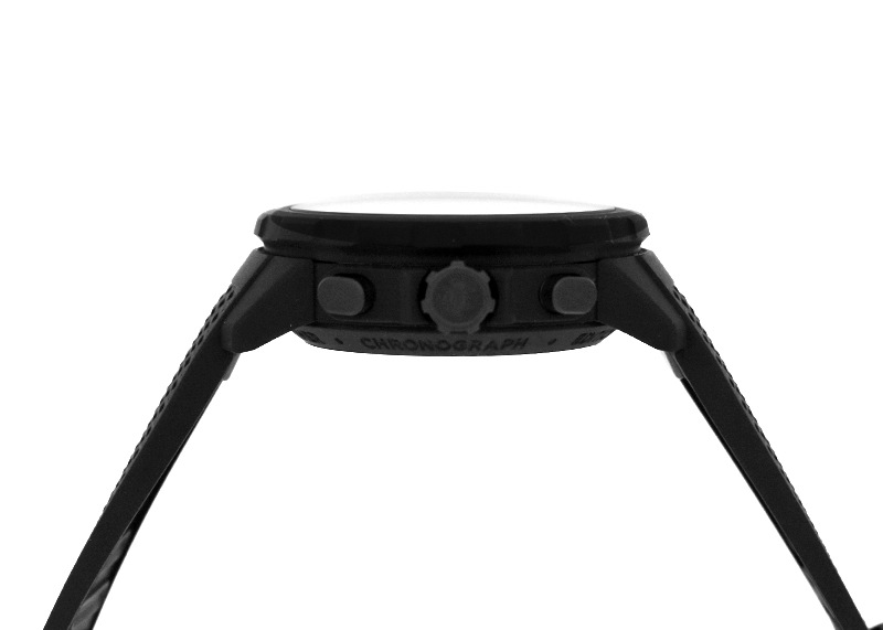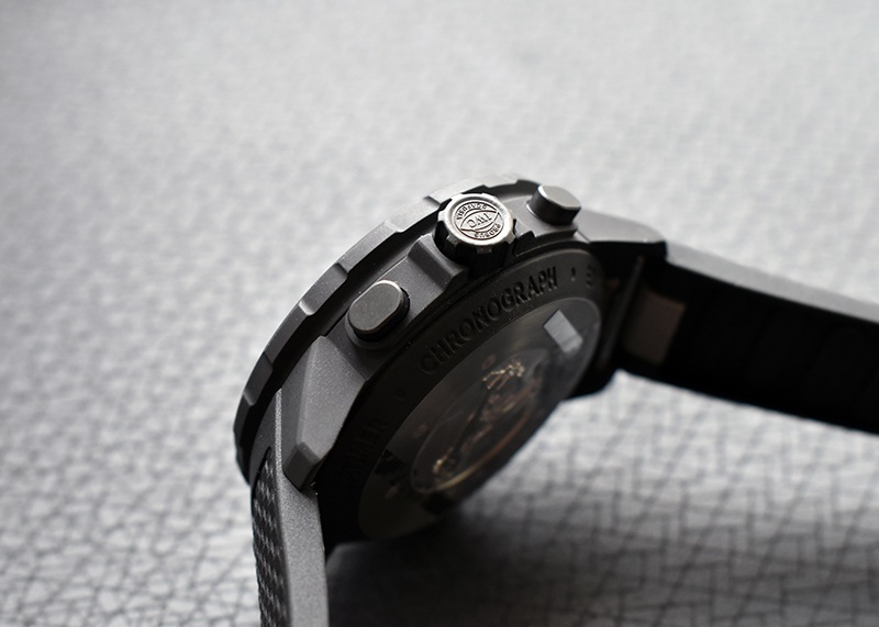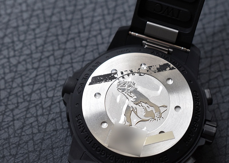 ステンレススティール製のケースにはガラパゴス諸島の大地をイメージした、マットブラックのラバーコーティングが施され、