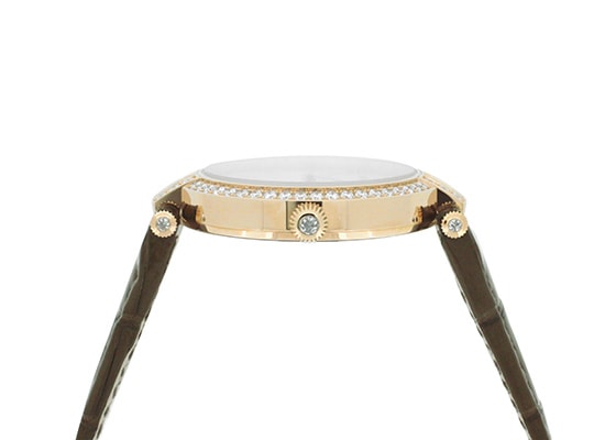 ローズゴールドのケース・バックルにはめ込まれたダイヤモンドは“キング・オブ・ダイヤモンド”の異名にふさわしい輝きを放ちます。31っmの文字盤にはホワイトシェルを使用。