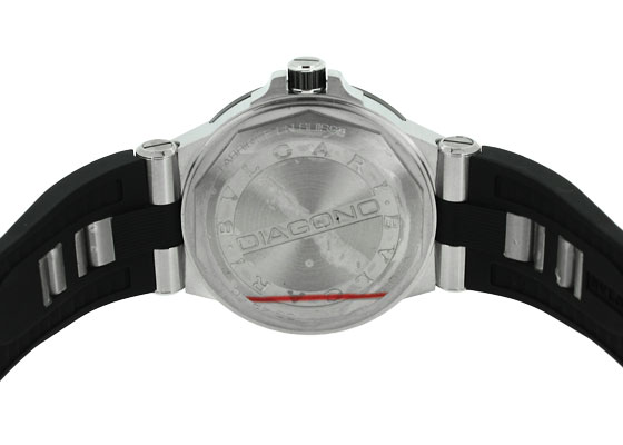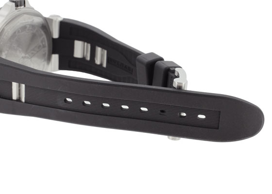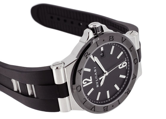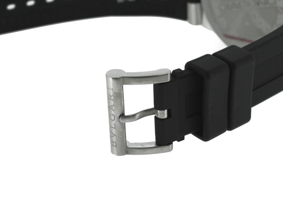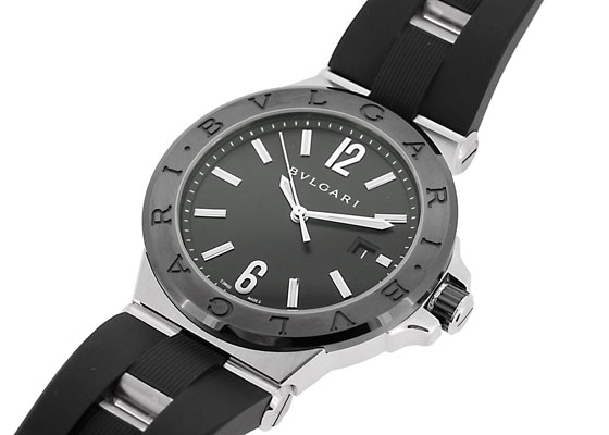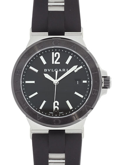 DLCコーティングを施したステンレススティール製ケースにブルガリのロゴが刻まれたブラックセラミックベゼルにブラックとシルバーでシックにまとめられたスポーティーなデザインとなっています。