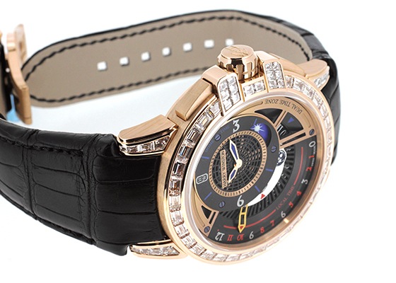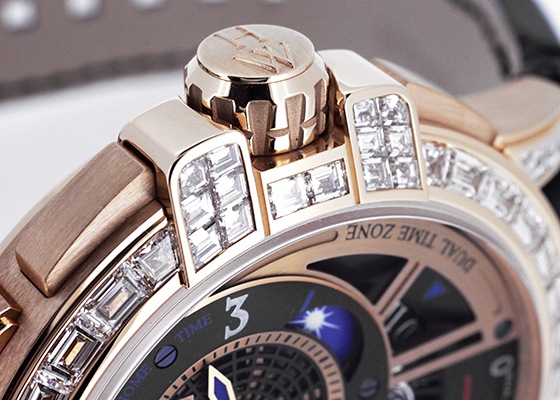 また、リューズによるクラッチ連結遮断機能を搭載。これによってレトログラードを両方向に回転することが可能となり、時差修正を瞬時に行うことが出来ます。