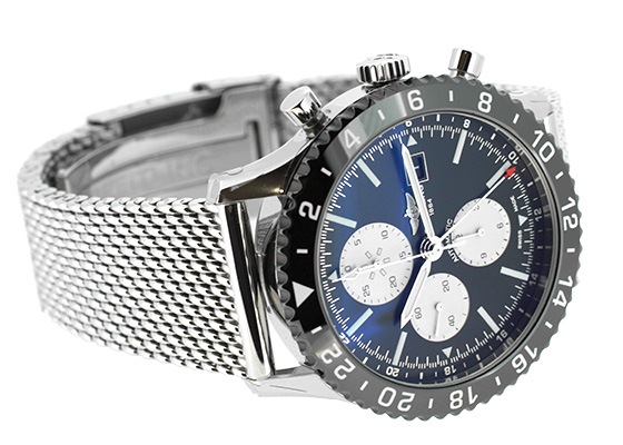 2タイムゾーンGMT機能搭載。ベゼルは傷の付きにくいブラックセラミック製。