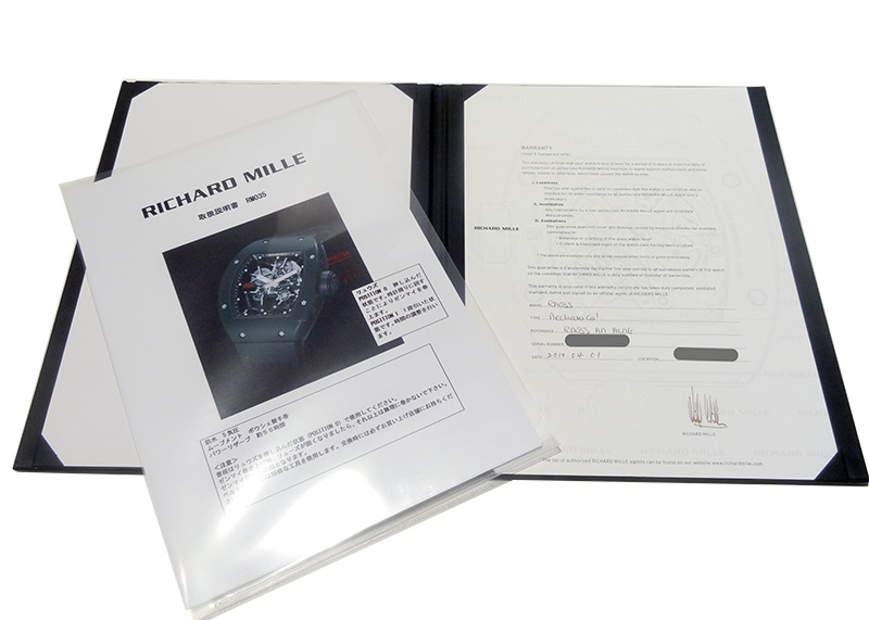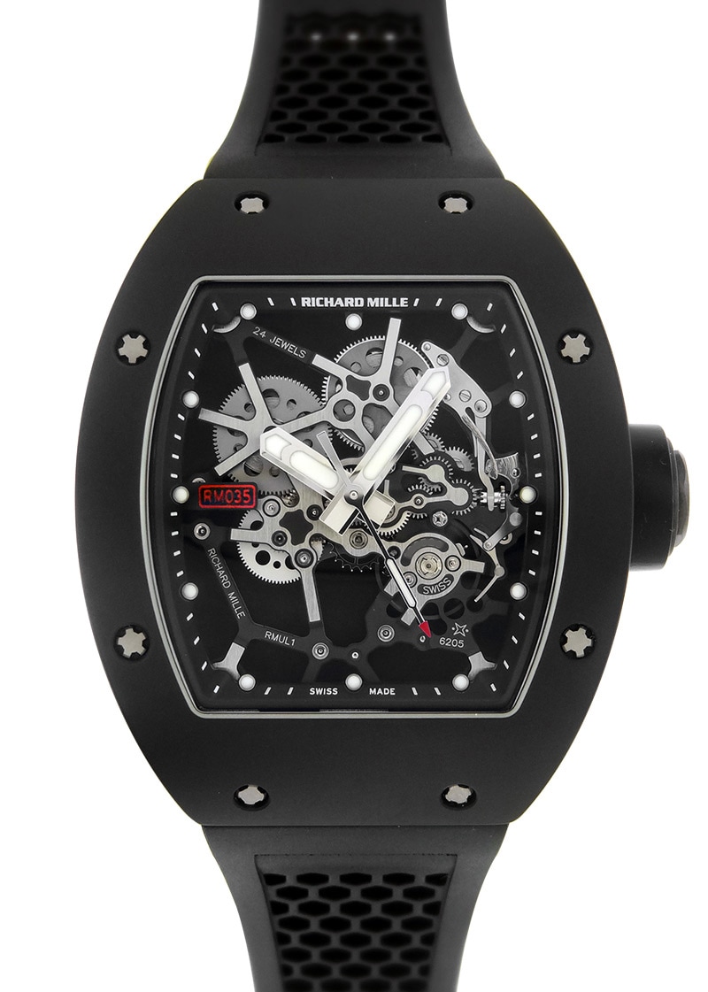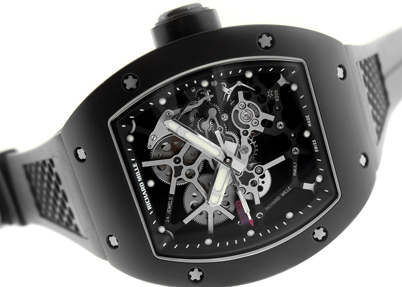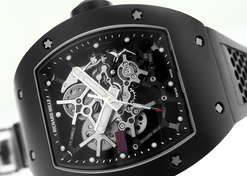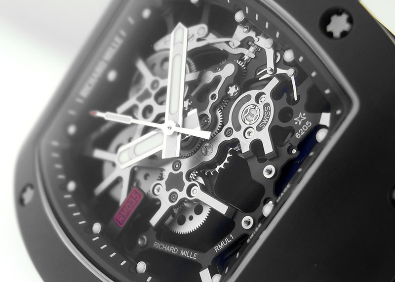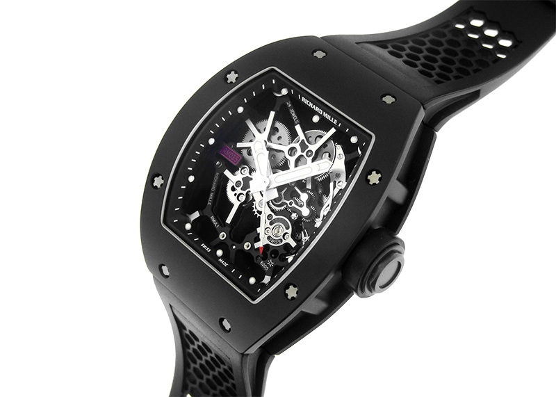 ラファエル・ナダルが着用したRM027からトゥールビヨン機構を取り除いた、わずか4.3gの軽量ムーブメント、総重量約40gの驚異的な超軽量シンプルモデルです。