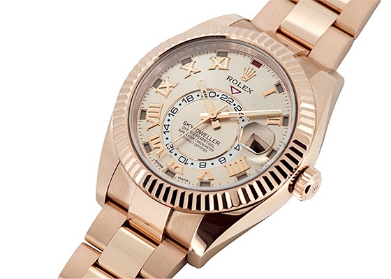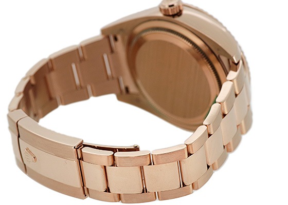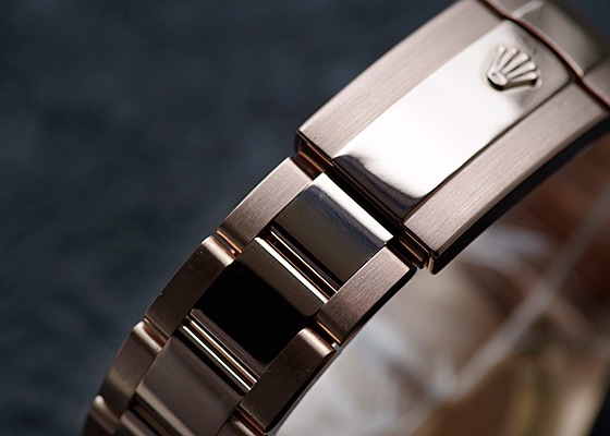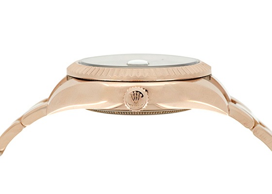 エバーローズゴールドはロレックスが開発した変色しにくい合金で華やかな品の良いカラーです。インデックスにもゴールドのアワーマーカーが使用され、美しいサンダストダイアルが目を惹きます。