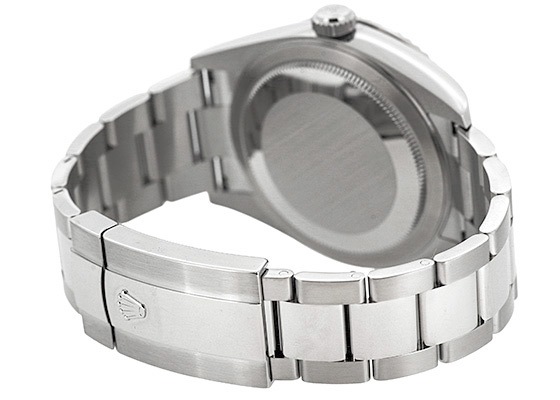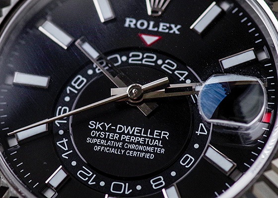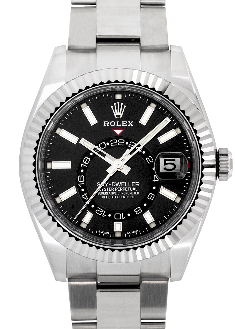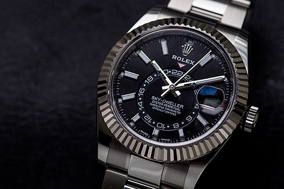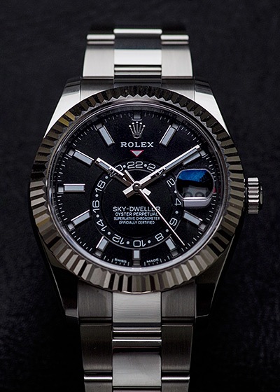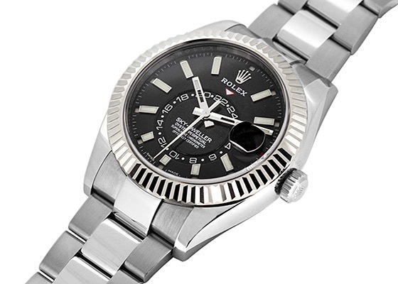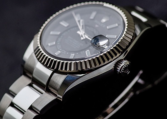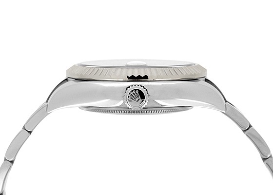 こちらの2017年発表モデルよりステンレスを取り入れたスカイドゥエラーがラインナップに加わりました。ベルトとケースがステンレスになったことで傷にも強くなりました。ベゼルにはフルーテッドベゼルと呼ばれるロレックスのアイコン的デザイン。これはゴールド素材にしか採用されないベゼルとなっています。