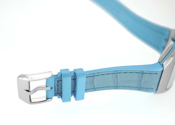 アリゲーターを表地に用い高級感を出しながら、裏地をラバー素材にすることで肌触りもアップさせています。 シルバー文字盤にはギョーシェが施され、フランク・ミュラーを象徴するビザン数字は立体的に仕上げ奥行きを持たせおしゃれな印象を与えます。