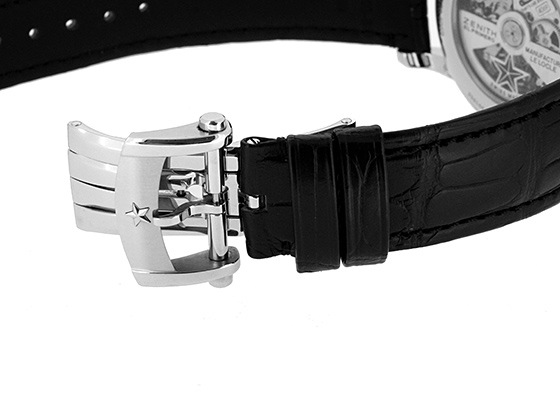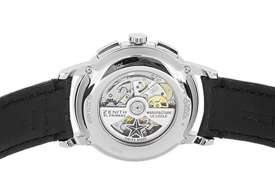 こちらはエリートシリーズですが、ZENITH社の伝説的クロノグラフムーブメント「エルプリメロ 4069」を搭載しております。 パワーリザーブは約50時間。