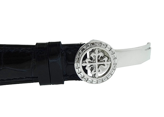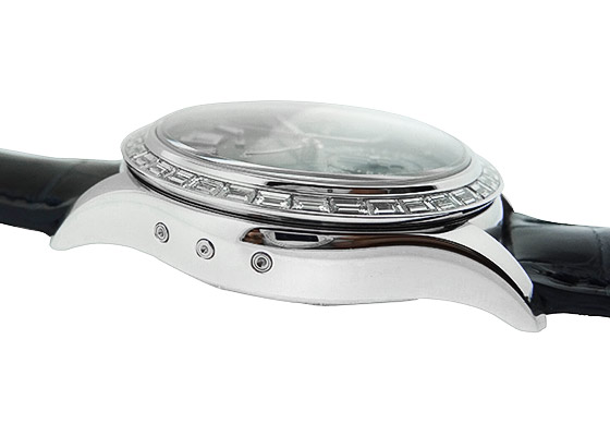 シースルーバックから覗く自社ムーブメントの美しさは勿論のこと、全面に配した36石のバゲットダイヤモンドの美しさも感嘆に値します。