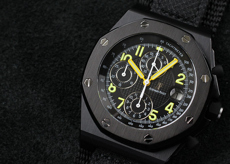 1999年にリリースされた希少モデル、[ロイヤルオークオフショア End of Days] モデル名の"End of Days"はハリウッド俳優でもあり、元カリフォルニア州知事を務めた[アーノルド・シュワルツェネッガー氏]が 1999年に主演した映画[End of Days ※邦名エンド・オブ・デイズ]のために作られたもので、世界限定500本のリリースでした。 ステンレススティール製のケースにPVD加工を施したブラックケース、ブラック文字盤にイエローのアラビアインデックスを採用。 これら全てがオーデマピゲとして初めての試みであり、このモデルが初めての限定版オフショアとなりました。 ストラップはアラミドファイバー製で強度・摩耗に強く、ハサミでは切れないほどの強靭さを誇ります。 リューズとプッシュボタンは現行のセラミックとは違いラバー製です。 こちらの腕時計は当店入荷後、オーデマピゲにてコンプリートサービス済みで、ストラップも新品のものに交換しております。 ケースサイドとラグにPVD加工の剥がれが若干ございますが、約20年前の腕時計だという事を考慮すると状態は良いかと思われます。 付属品として、箱とドライバーがございます。 さらに詳しい内容を確認されたい方はお気軽にお問い合せ下さい。 仕様変更前のメーカー型番 Ref: 25770SN.O.A001KE.01 と同一モデルになります。