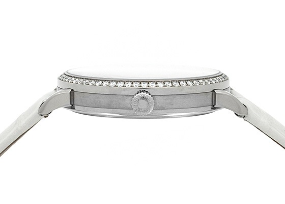 無駄のない調和のとれたデザインと二つとないマザーオブパールの輝きが品の良いモデル。ホワイトゴールド製のケースにはダイヤモンドが埋め込まれ、さらに華やかで洗練された佇まいを醸し出します。