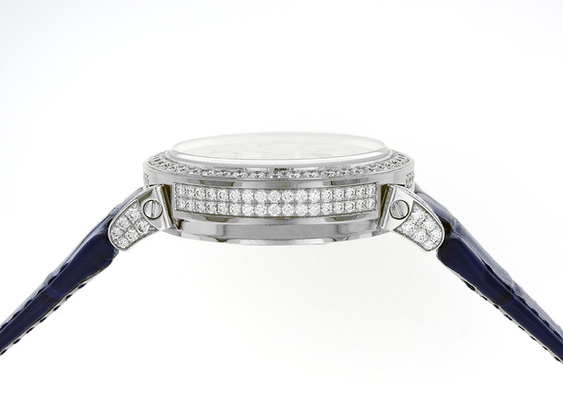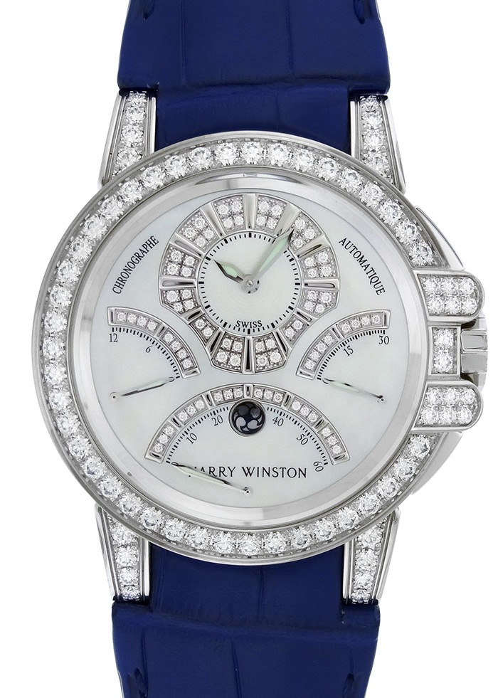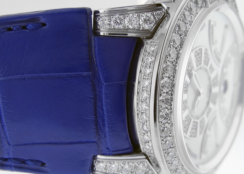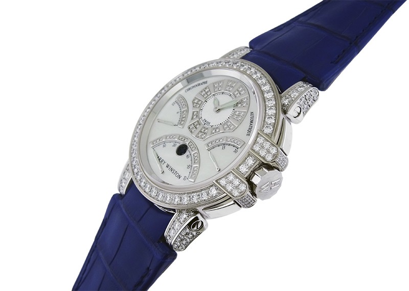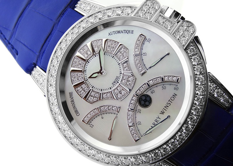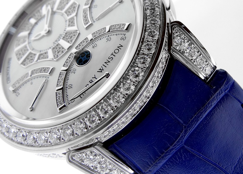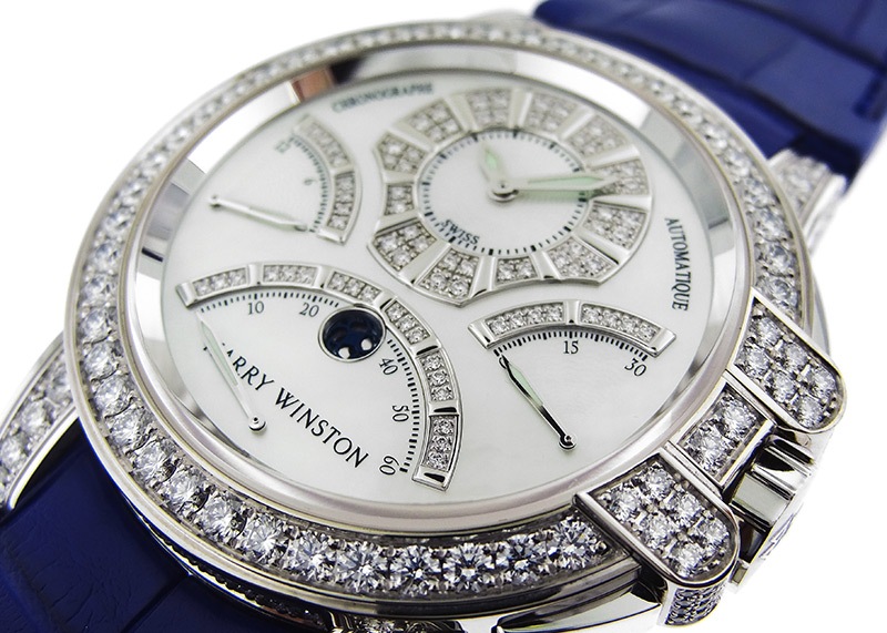 ケースと文字盤に使用されたダイヤモンドは総6.65ct、シェル文字盤との相性も抜群、内外ともにハリーウィンストンの贅が盛り込まれた最高級モデルといっても過言ではないでしょう。