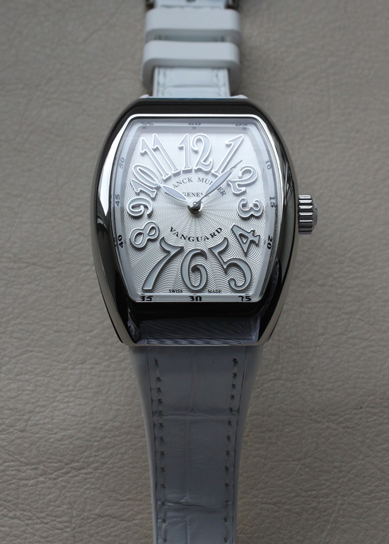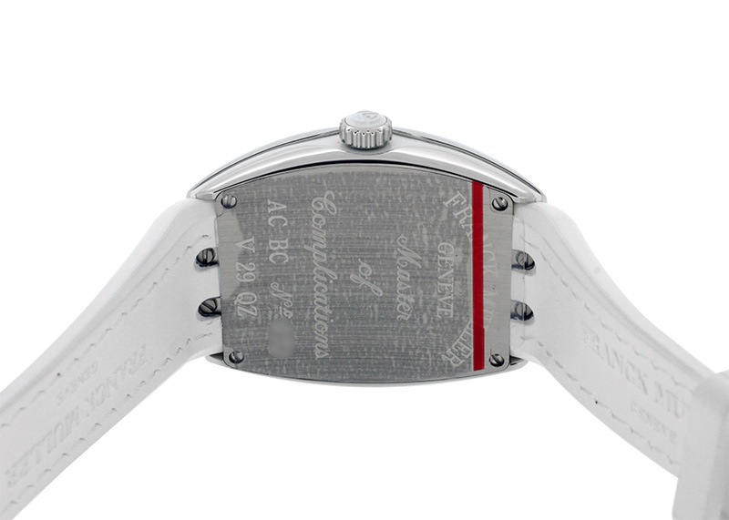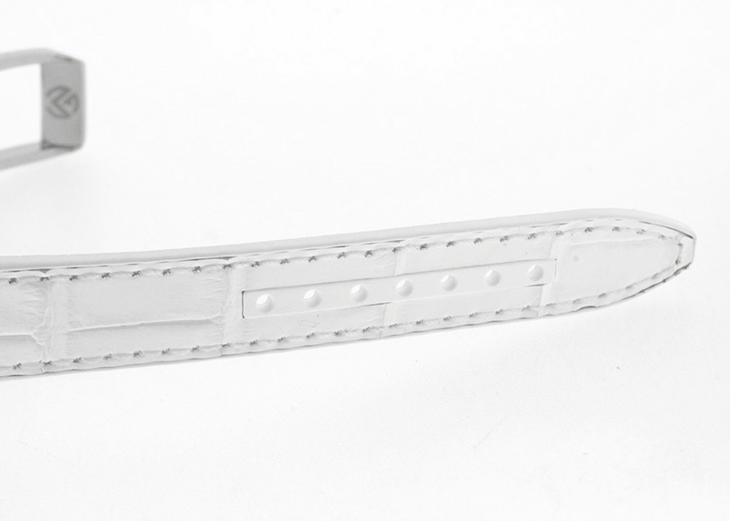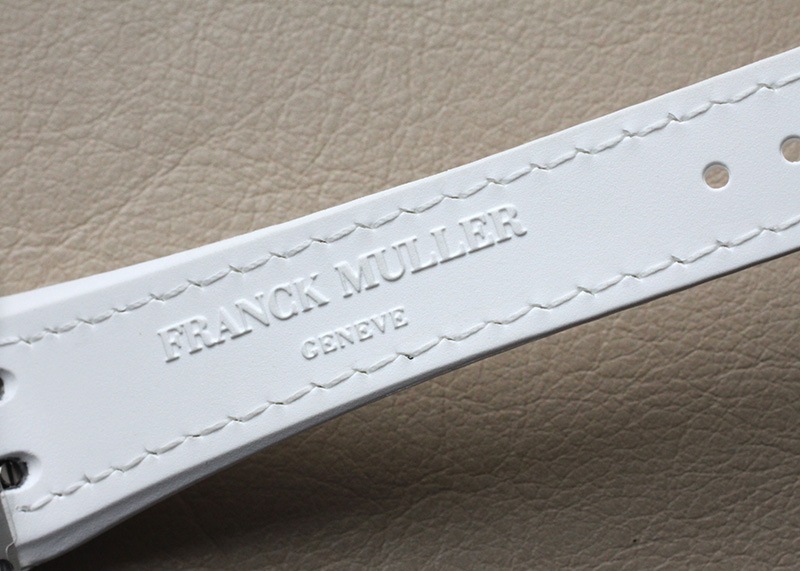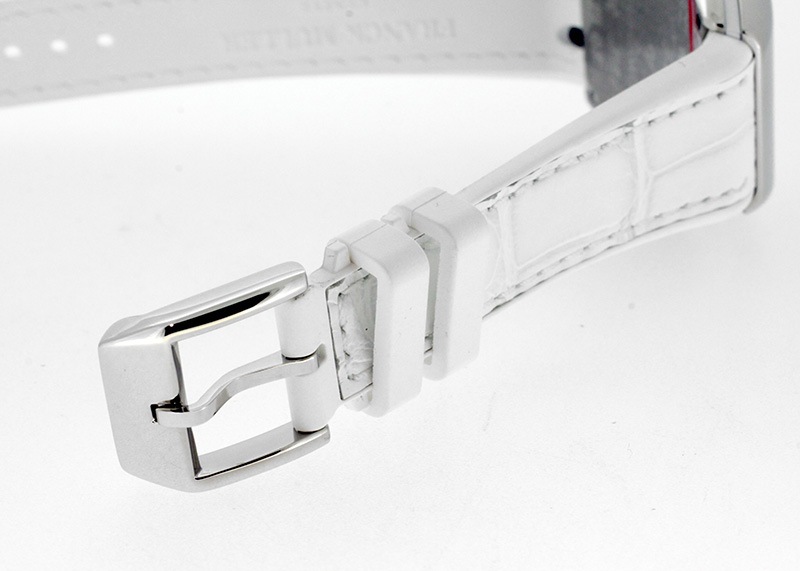 アリゲーターを表地に用い高級感を出しながら、裏地をラバー素材にすることで肌触りもアップさせています。 シルバー文字盤にはギョーシェが施され、フランク・ミュラーを象徴するビザン数字は立体的に仕上げ奥行きを持たせおしゃれな印象を与えます。
