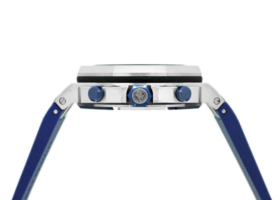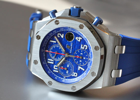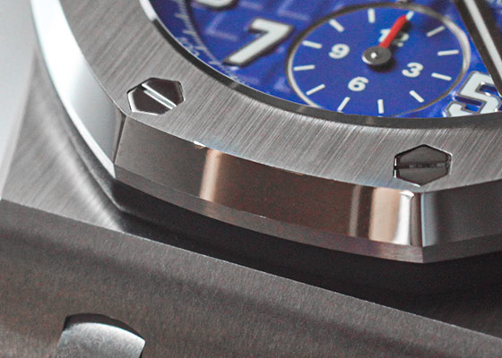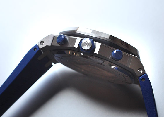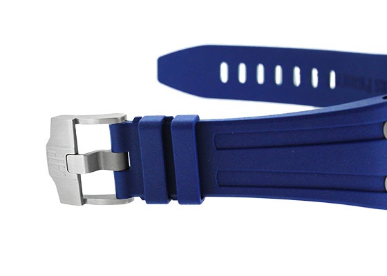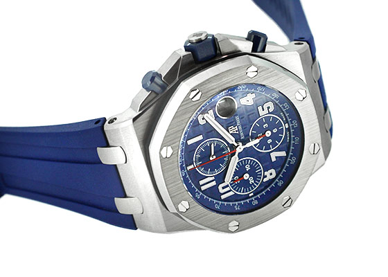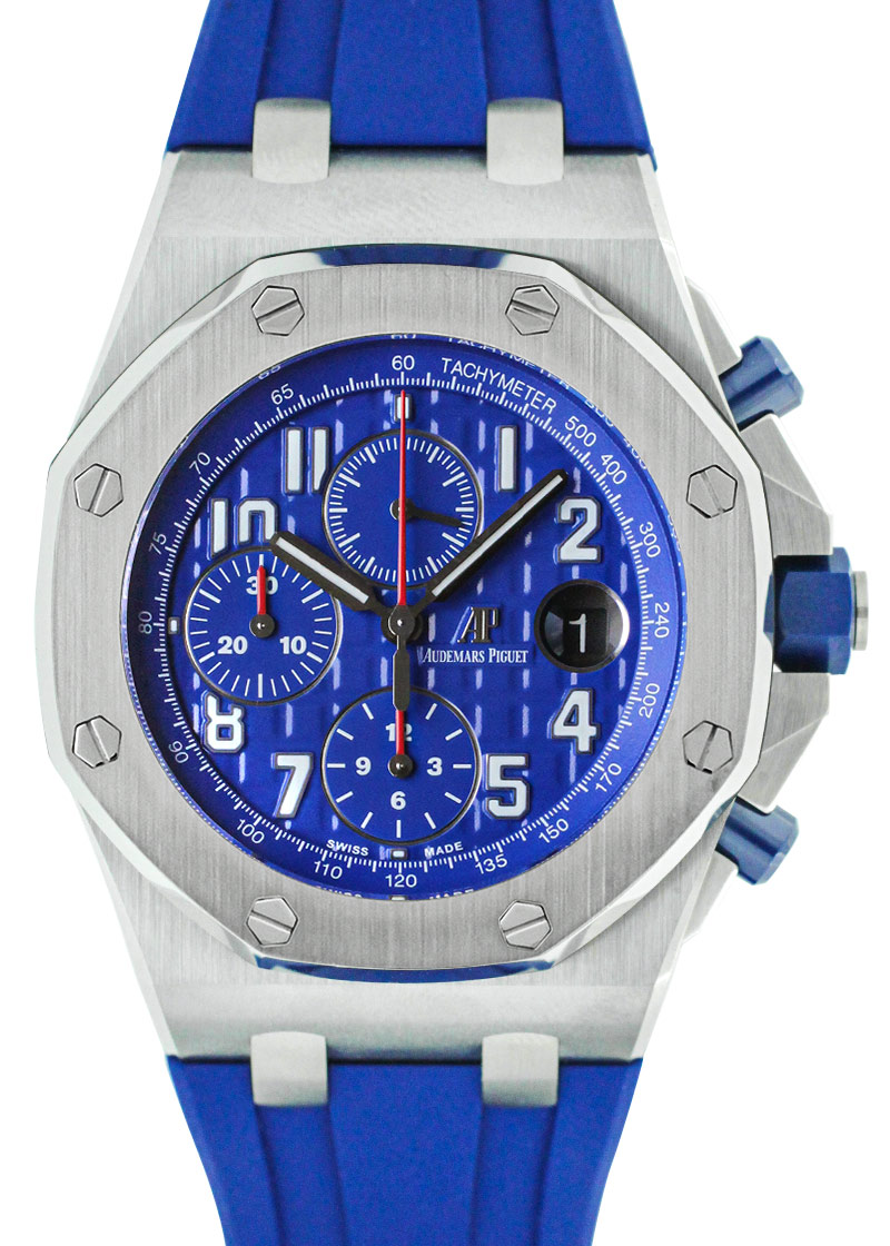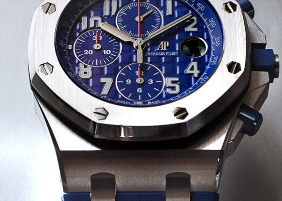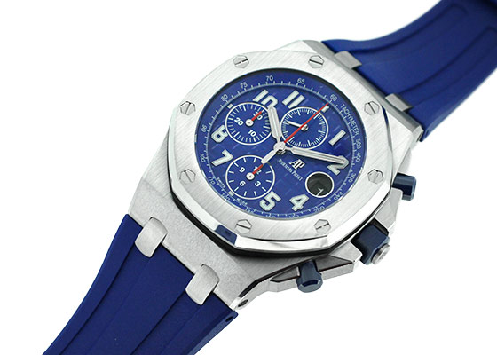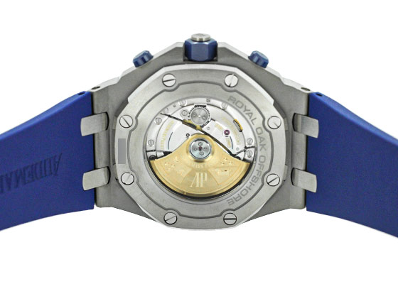 SIHH 2018年発表の新作が入荷いたしました。 1993年に誕生し、今年で誕生25周年を迎えた「ロイヤルオーク オフショア」 オーデマピゲを代表するモデル「ロイヤルオーク」のオリジナルデザインを踏襲しながらも、スポーティーかつタフなデザインが人気を博しています。 42mmのロイヤルオークシリーズで初めて採用した「ブルーセラミック」製のプッシュボタンに メガ・タペストリーを施した鮮やかで統一性のあるブルーダイアルと耐久性に優れたブルーラバーの、 ブルー・オン・ブルーのかつてないデザインがスポーティーでありながらも品格を感じさせます。 裏蓋から覗く 自社cal.3126/3840 は50時間のパワーリザーブ。22Kゴールド製のローター仕様です。 こちらの商品は、6時位置のベゼル部分に極小さなキズがあるため、訳あり品としてお出ししております。