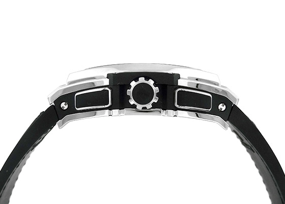軽く、腐食しにくいチタン製のケース。ベゼルには156個(1.35ct)のダイヤが施されています。