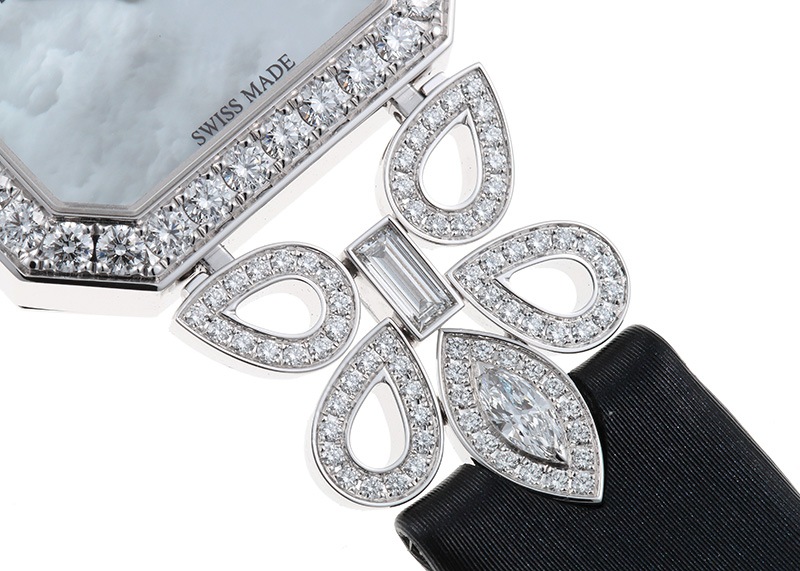 角度によって輝きを変えるマザーオブパールの文字盤。その上下には美しく咲く2輪のユリの花が取り囲み、腕元をこの上なく華やかに演出します。
