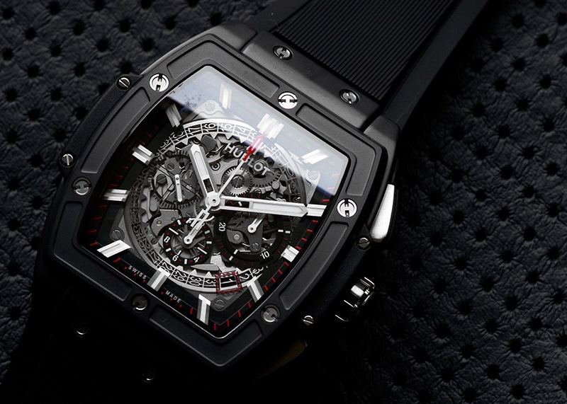 45mmのトノー型の腕時計を構成するのは、サテン仕上げのセラミックとラバーストラップ。