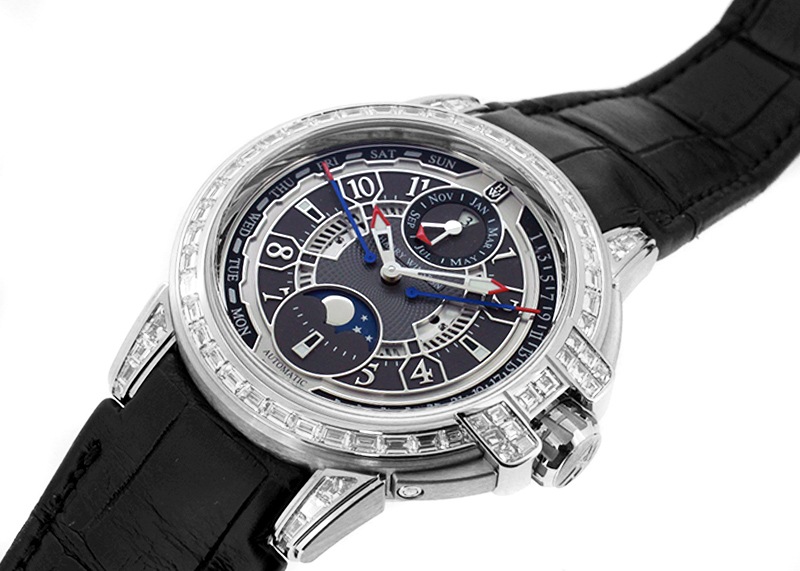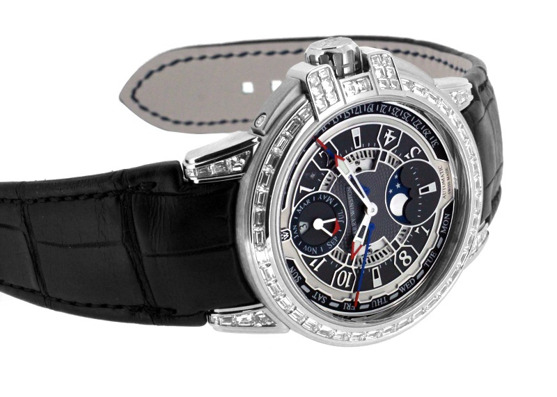 文字盤上には月表示、文字盤下にはムーンフェイズ表示、左右にはデイデイトをレトログラード表示、文字盤に階層を設けることで機能面をバランスよく見せる卓越した洗練性と他に類のない芸術性はハリーウィンストンならでは。