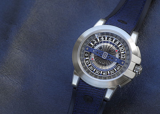 ブランドの発祥地であるニューヨークマンハッタンブリッジをモチーフとしたセンターブリッジを中心に上下に分かれるレトログラード式の時分表示は上部に時表示、分表示を下部に配置し外周の日付表示を含め全て同心円状に配置したシンメトリー構造となっています。
