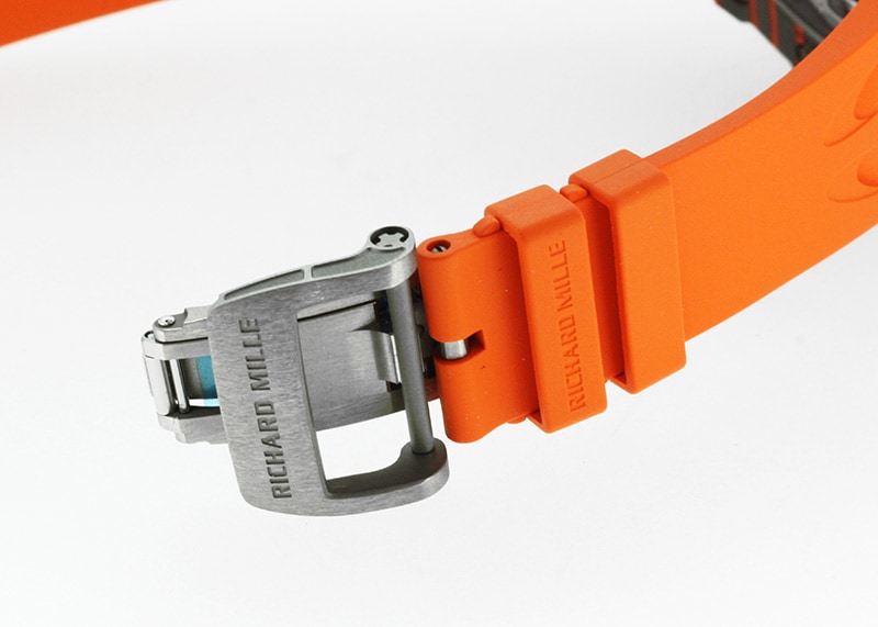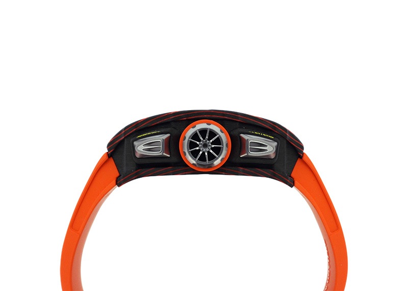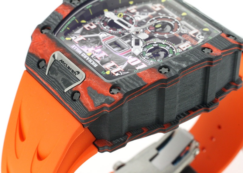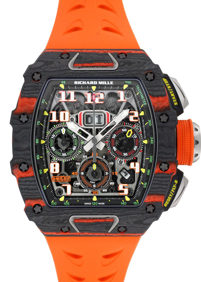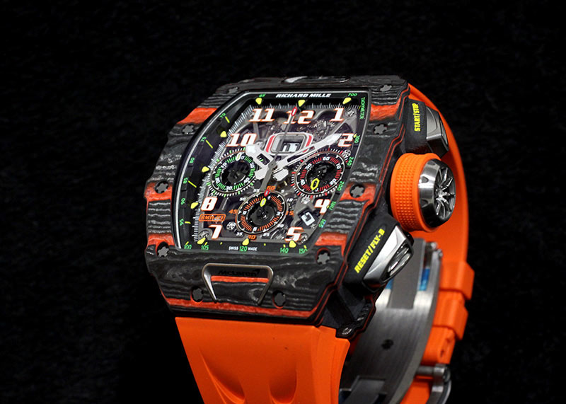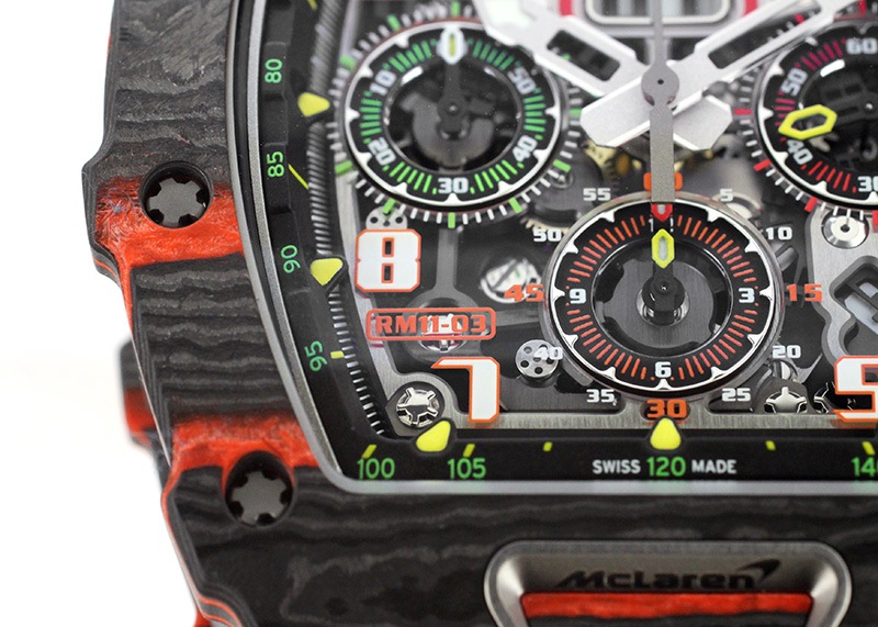 抜群の人気を誇った「RM011/フェリペマッサ」の後継機種で2017年にリリースされた「RM11-03」。 『時計のF1』をコンセプトに、2001年にリシャール ミル氏が創業したリシャール ミル。 コストや、その他の妥協を一切許さず、発表時最高の技術と素材を惜しみなく投入して作られた時計は、世界中の時計ファンを魅了し続けています。 こちらの腕時計はイギリスの名門F1チーム「マクラーレン/McLaren」とのコラボレーションモデルで、同社の車を所有するオーナーに優先的にデリバリーされ、世界限定500本です。 マクラーレンといえばタグホイヤーのイメージが強いですが、20年以上続いた提携を解消し、新たに2016年よりリシャールミルとパートーナーシップを提携。 各デティールを見ていくと、まず目を引くは何と言っても鮮やかなオレンジカラー。これはマクラーレンの創始者「ブルース・マクラーレン氏」がF1マシンで使用し、現在では同社のコーポレートカラーである”パパイヤオレンジ”を使用。クロノグラフのチタン製プッシャーとリューズは、同社のスポーツカー”720S”のヘッドライトとホイールからデザインが踏襲されている。 機能面では、基となっているRM11-03と変わらず、アニュアルカレンダー・フライバッククロノグラフ・オーバーサイズビッグデイトを搭載した、コンプリケーションウォッチです。 ラグジュアリースポーツの頂点の「リシャールミル」と名門チーム「マクラーレン」とのコラボウォッチは、所有欲を引き立てる一本に仕上がっています。 ※参考定価 23,430,000円(税込)
