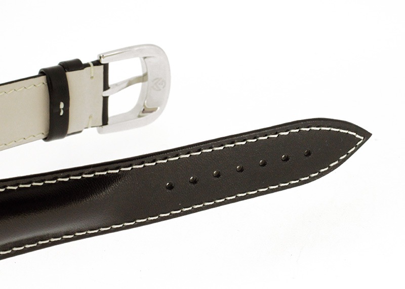 こちらはブラック文字盤にブラックレザーのモデルで、青い針が美しい1本です。