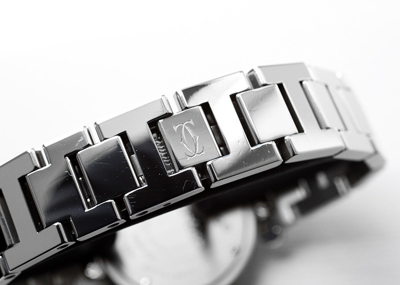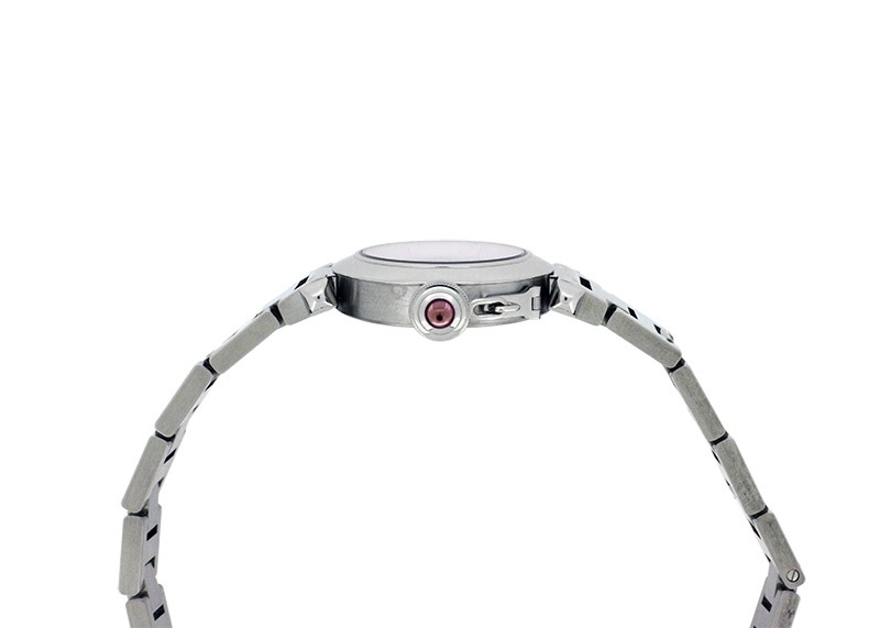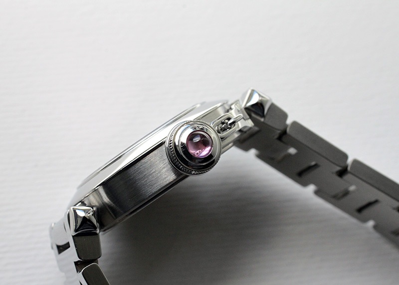 艶ありのシルバーケースにピンクスピネルが施されたリューズプロテクターを使用しており、カルティエらしいシンプルでクラシカルなデザインは、スーツやジャケットに相性抜群です。