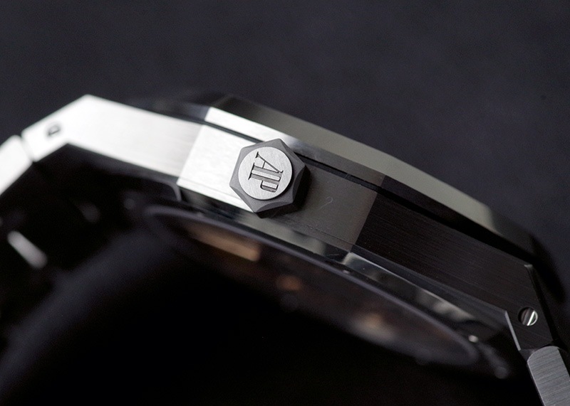 オクタゴン(8角形)のベゼルには配されたWG製のビスは、ベゼル、ケース、特殊防水ガスケット、ケースバック、すべてを貫通して固定しています。