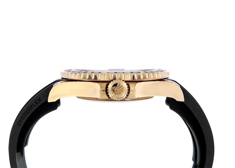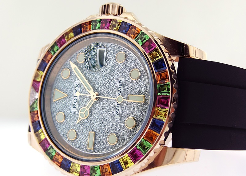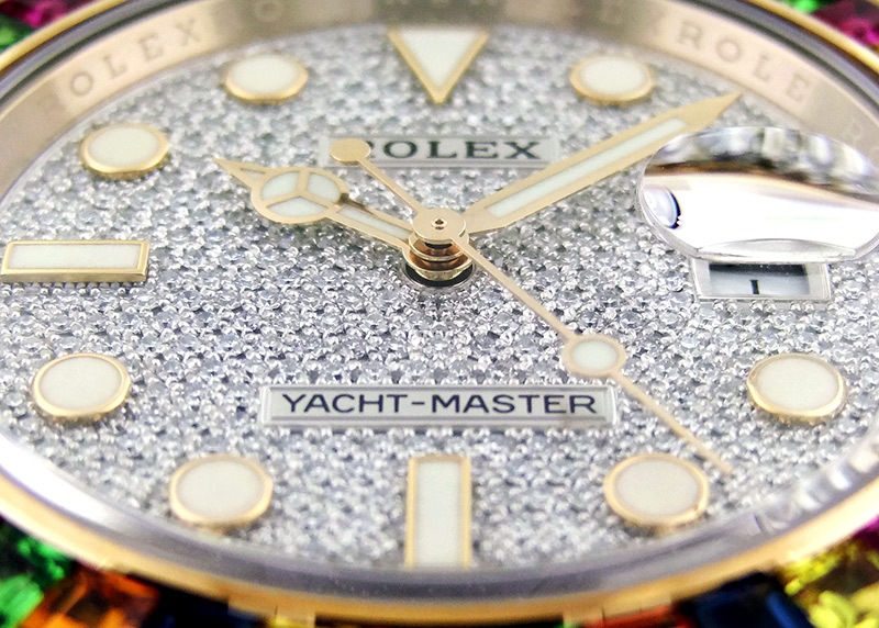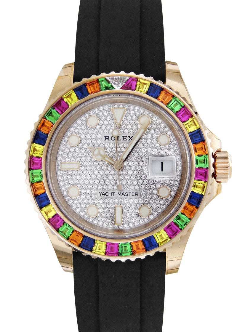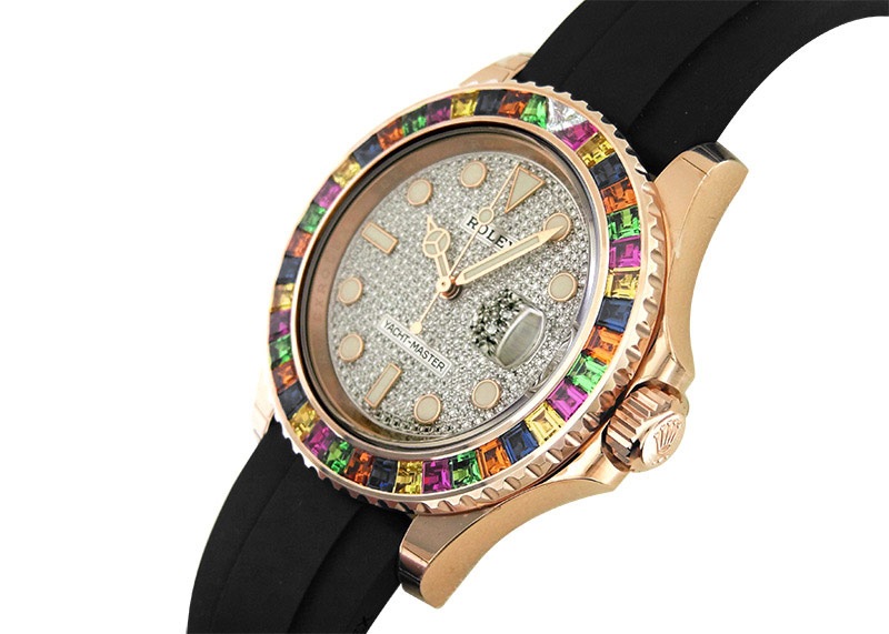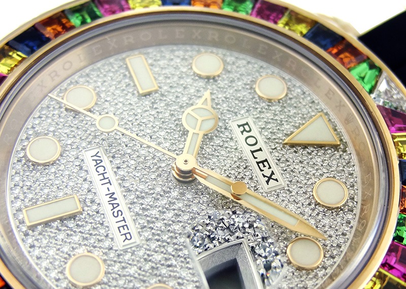 2017年バーゼルワールド発表で一躍話題となった「Ref:116695SATS ヨットマスター 40」 通称ハリボー(HARIBO)が入荷しました。 ピンクゴールドよりも退色しにくいと言われる、ロレックス独自配合によるエバーローズゴールド製のケースに ベゼルに大胆にもセッティングされた5色のカラフルな宝石が美しいスポーツモデル。 ピンク、イエロー、ブルー、オレンジのサファイアを32個。グリーンにはガーネット系の中でも希少価値の高いツァボライトを8個用いています。 12時上には逆三角形にカットされた大粒のダイヤをセッティング。 人工石を使用せず、カラーの整った大粒の天然石にバゲットカットを施しています。 文字盤にはパヴェカットを施したダイヤモンドを全面に敷き詰めており、煌びやか且つ非常に手の込んだハイジュエリーウォッチです。 ストラップには、ロレックス史上初のラバーベルト「オイスターフレックス」を装着。 ヨットマスターの為に開発された「オイスターフレックス」は、弾性の強い薄い金属にラバーをコーティング。 ブレスレットにも負けない耐久性を実現しており、最近ではデイトナでも装着モデルがリリースされています。 腕周りは 15~16cmのサイズとなります。 参考定価:¥8,802,000