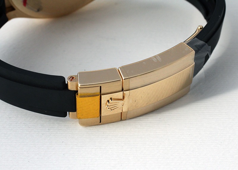 ヨットマスターの為に開発された「オイスターフレックス」は、弾性の強い薄い金属にラバーをコーティングし、ブレスレットにも負けない耐久性を実現。