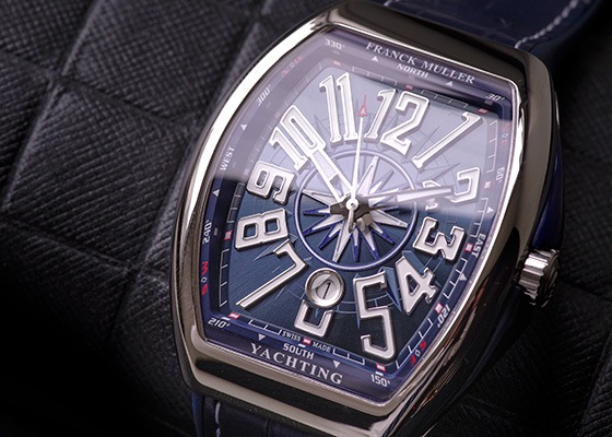 伝統と革新を重んじながら、独自のスタイルを追求する稀代の天才時計技師フランク・ミュラー。 他ブランドのトノー型の時計とは一線を画す、フランクミュラーの代名詞とも言えるケースです。 スポーティでありながら高級感のあるデザインの「ヴァンガード」 ストラップをケースの内部に入れ、ラグをなくすことで、一体感を生み出しました。 手首のカーブに沿った美しいラインを描き、絶妙なフィット感を与えます。 こちらは豪華クルーザーの世界観にインスピレーションを受け発表された「ヴァンガード ヨッティング」 海の色であるブルー、文字盤には羅針盤の風配図が描かれ優雅なクルージングを思わせます。 またこれまでのモデルと違い、リューズガードが付きよりスポーツモデルらしくなりました。 6時位置にデイト表示機能が付き、アリーゲーターのベルトにはラバーが裏打ちしてあるため大変使いやすい仕様となっております。