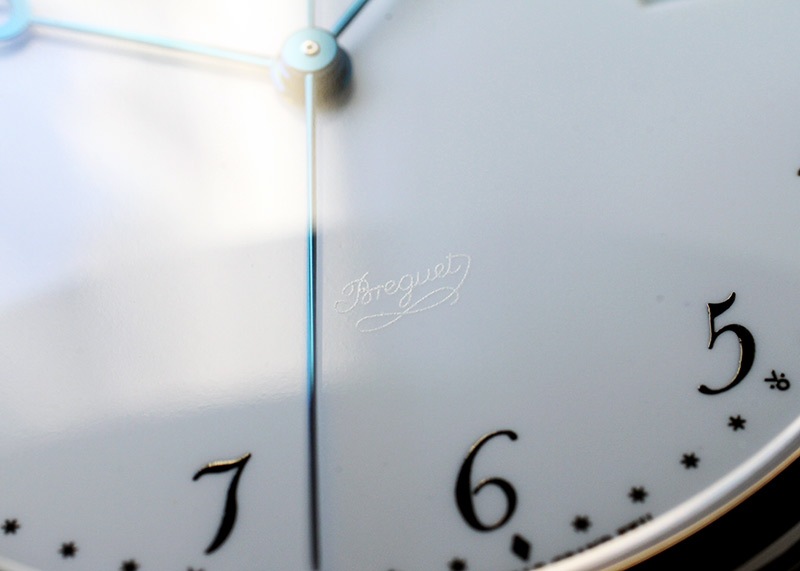 ブレゲの鮮やかなブルースティール針と炉焼きのホワイトエナメル文字盤の組み合わせが、精巧な装飾により上品な雰囲気を時計に与えています。