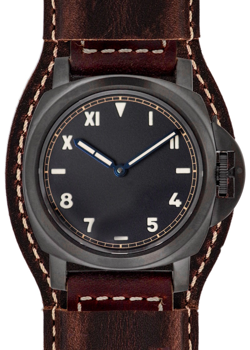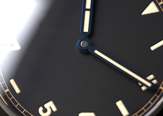 シンプルなブラックの文字盤にローマ数字とアラビア数字を独自のスタイルで組み合わせたインデックスはパネライ初期の一部の文字盤で採用され、カリフォルニア ダイアルとも呼ばれています。