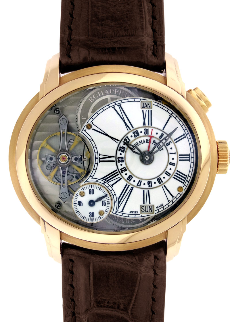 ローズゴールド製の47㎜と大迫力のケースからは、立体的に浮き上がる様にセットされた文字盤・スモールセコンド・テンプ・ダブルスパイラルを眺める事が出来ます。