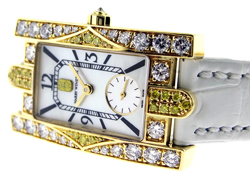 立体感のあるケースとジュエラーらしく最高級の大粒ダイヤを贅沢にも敷き詰めてあり、イエローサファイアがより華やかな印象を与えます。