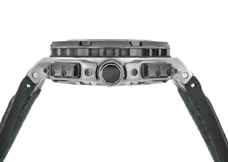 軽量で耐久性に優れたチタン製のケースに、ギアパーツにインスパイアされたリューズ。