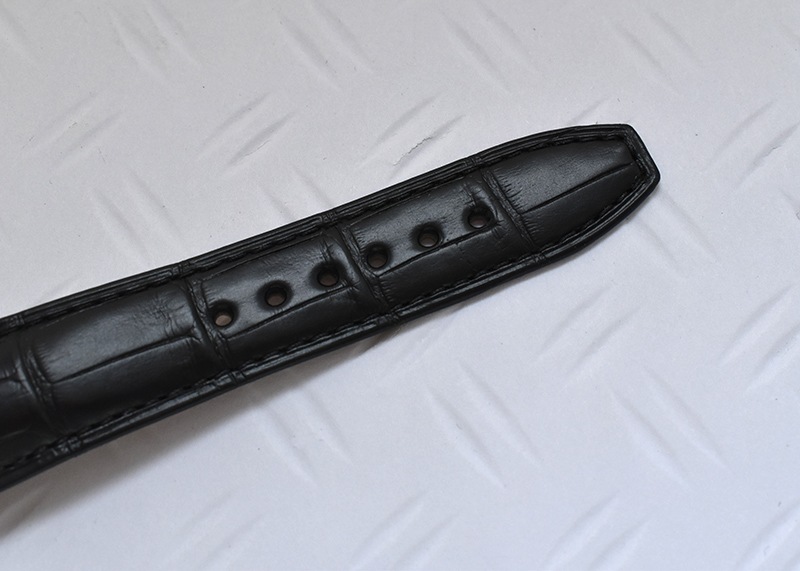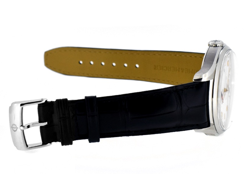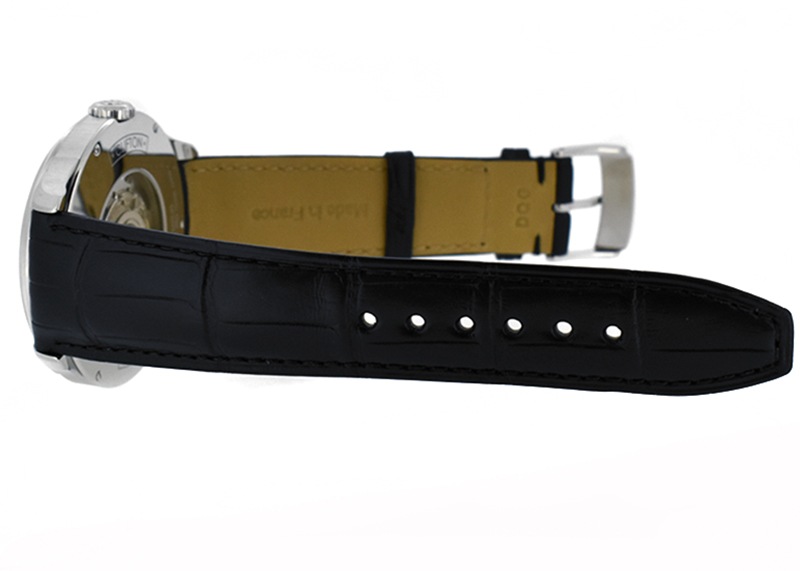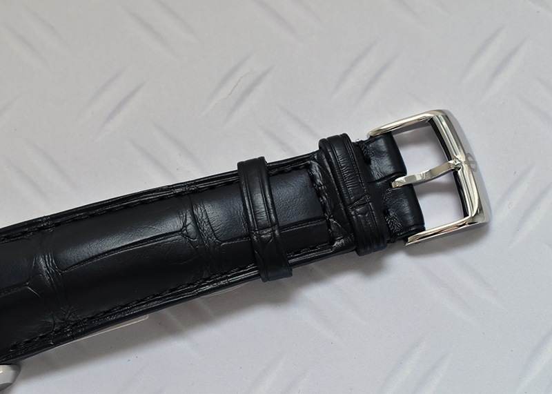 3時位置にデイト表示、6時位置にパワーリザーブ、12時位置にデュアルタイムを搭載。