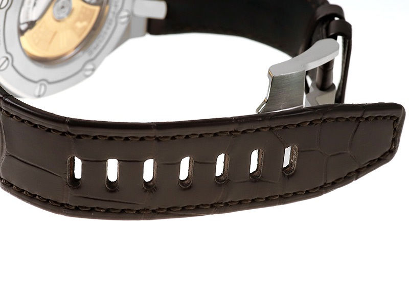 ブラウンアリゲーターのストラップはハンドステッチでパティーヌ仕上げが施してあります。