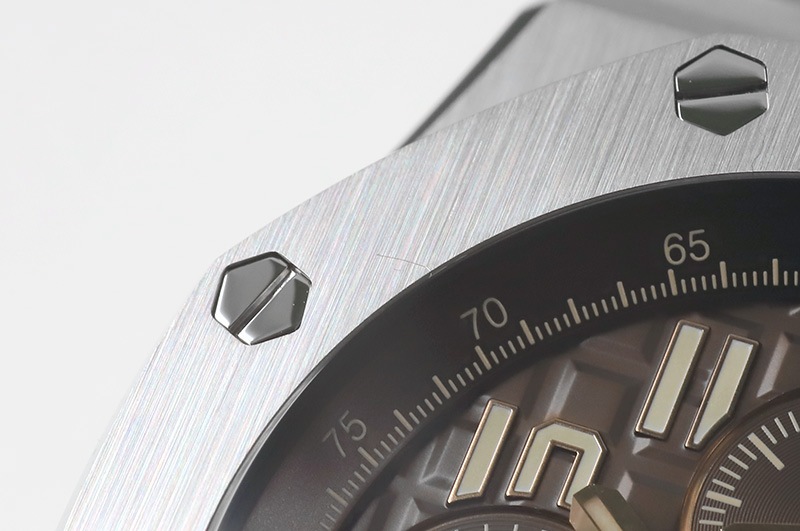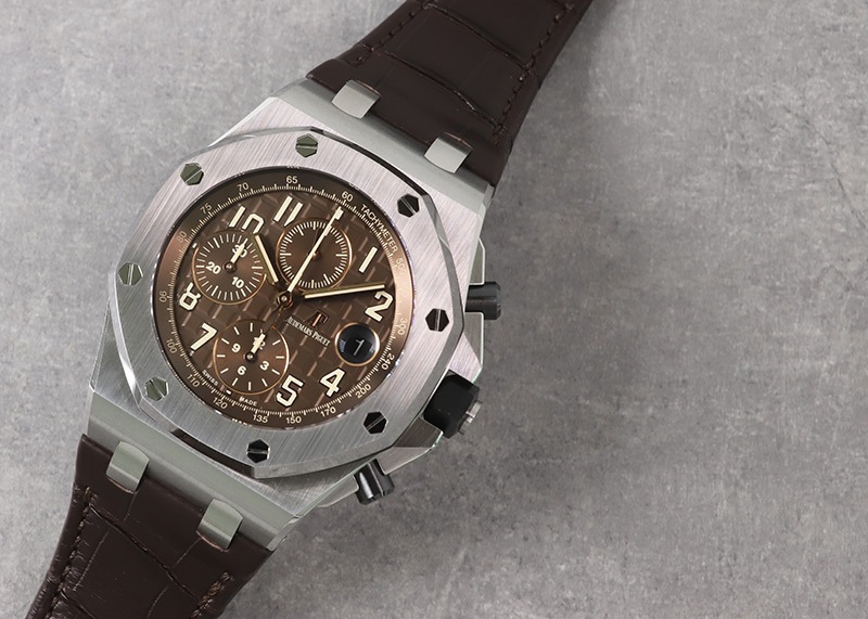 こちらの「ロイヤルオーク オフショアクロノグラフ」はメガタペストリー模様のブラウンダイヤルには蓄光処理を施したベージュインデックスとピンクゴールド製の指針がまとまりよく品のある仕上がり。ブッシュボタンはセラミック製へと変わりました。