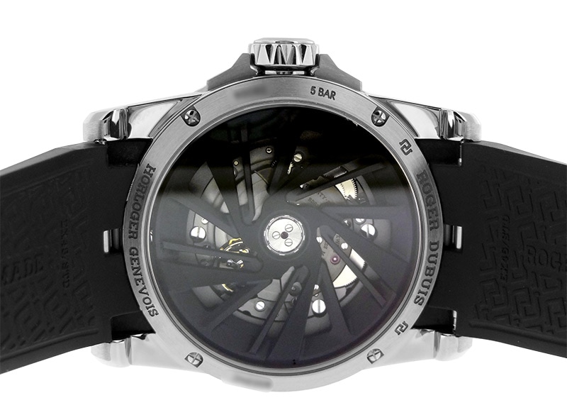 中心を軸にして放射線状に伸びる独特な書体のローマ数字や深く刻みの入ったベゼルなど、ロジェデュブイのインスピレーションを表現する大胆なデザインが特徴で、そのこだわりのデザインはシースルーバックからのぞくムーブメントにも見てとれます。