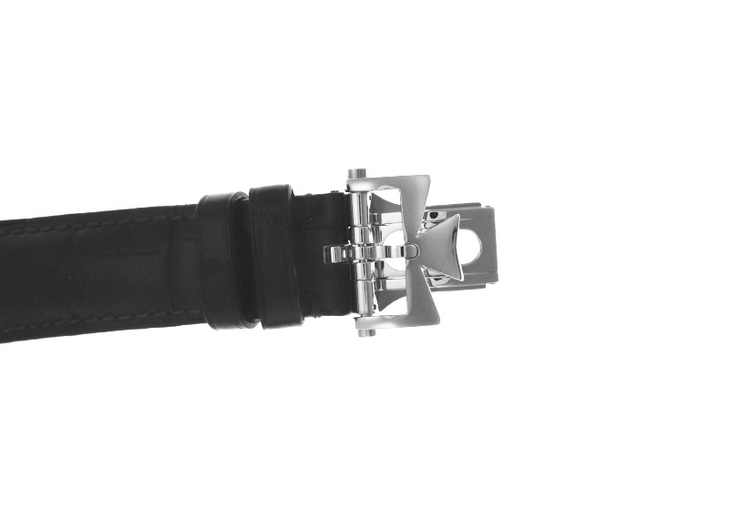 ラウンドケースに、ブランドのシンボルマークでもあるマルタ十字を模ったラグが特徴。
