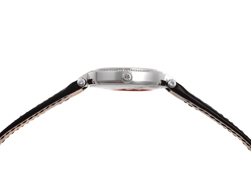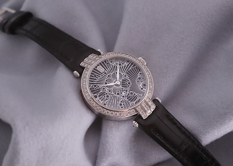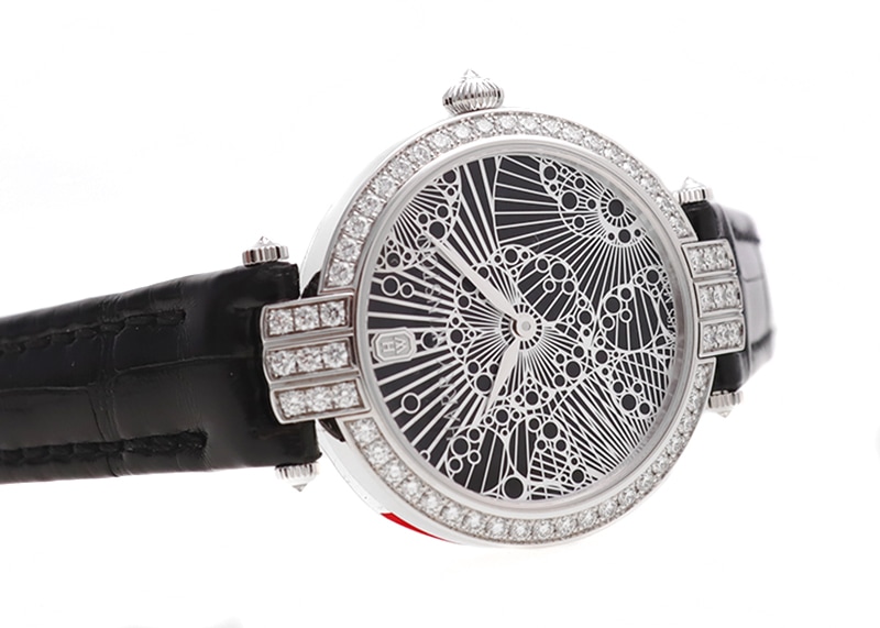 ブラックベースの文字盤にはパール加工の施されたレースが全面に施されており見る者の心を虜にします。