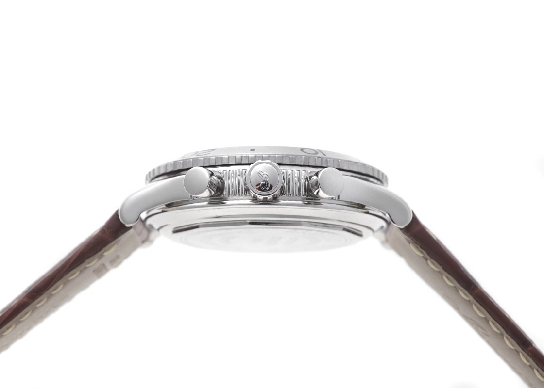 ミドルケースにはブレゲと分かるコインエッジのデザインが盛り込まれたパイロットウォッチで、風防はドーム型です。