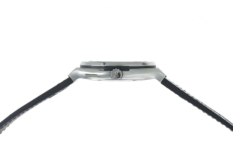 シンプルな3針とカレンダー、マットブラック文字盤、ブラックレザーはビジネスユースでもお使いいただけます。