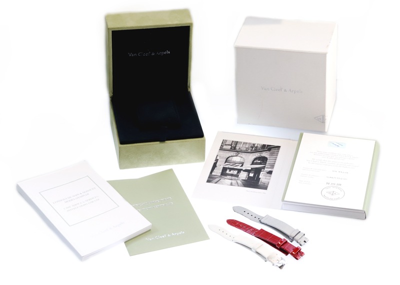 箱、保証書、交換用のストラップ(赤色 未使用アリゲーターベルト 1本)が付属します。