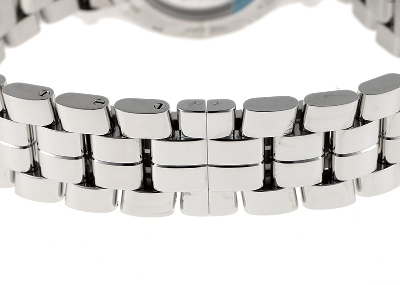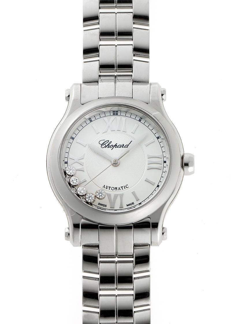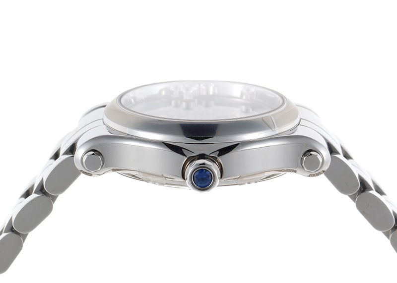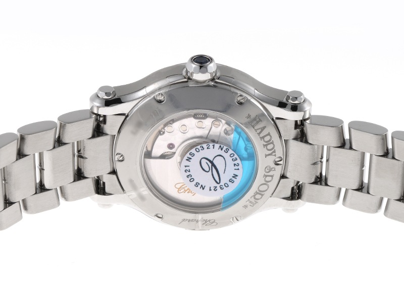 スイス随一のラグジュアリーウォッチブランド ショパールより、代表モデル「ハッピースポーツ」が入荷しました。 1860年ブランド設立から160年の歴史を紡ぐショパール。 一時は宝飾時計ブランドへ売却された時期があったことで、高精度機械式時計だけでなく高級宝飾品も得意とする現在のスタイルを確立しています。 1976年に発表したハッピーダイヤモンドは2重にした風防の中にダイヤを封入するという斬新さでブランドのアイコンとなりました。 ハッピースポーツは1993年そのデザインを継承しつつ、より自由な精神を持つ現代女性の為にデザインされました。 こちらの30mmサイズは待望のミニサイズとしてリリースされました。 この為に特別に開発された自動巻きムーブメント09.01-Cが搭載されており、シースルーバックからその動きを見ることが出来ます。 繊細なギョーシェ彫りの文字盤の上には5粒のダイヤが封入され、腕の動きに合わせて踊るように動き輝きを放ちます。 箱と国際保証書が付属いたします。 商品状態は新品ですが、メーカー出荷より年数が経過しているため未使用品として掲載しております。 さらに詳しい内容を確認されたい方は、お気軽にお問い合せ下さい。 ※生産終了品 参考定価 940,500円(税込)